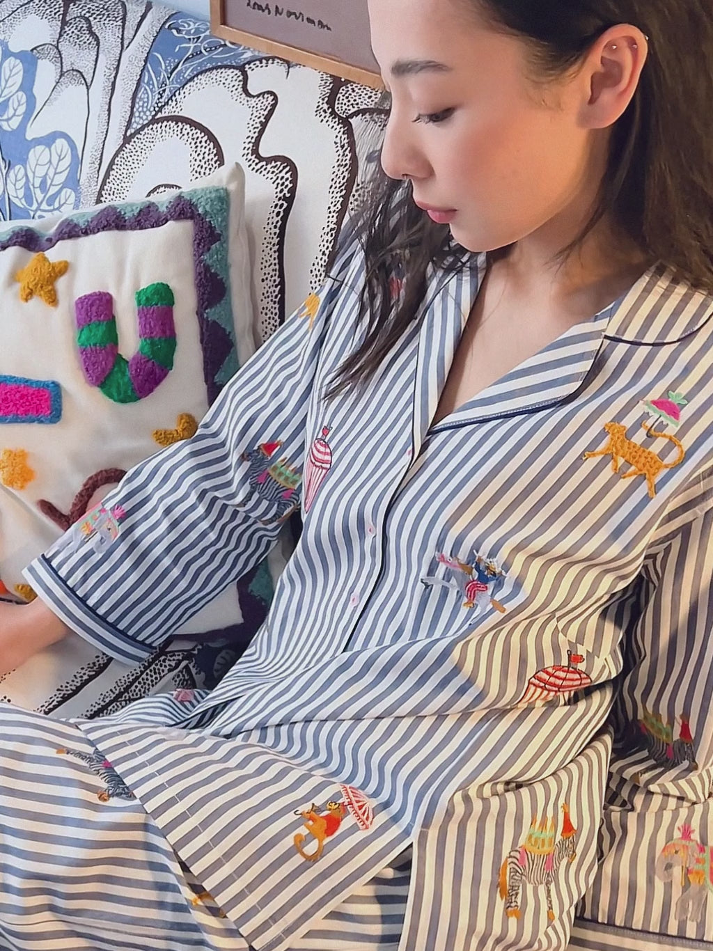 By now, pyjamas stepping out of the bedroom is hardly a secret. Our signature take is relaxed yet elegant — equally at ease curled up on the sofa as it is dressed up for high tea with heels and a sweeping cardigan. A classic shirt-and-trouser set, cut slightly oversized for that effortless fit, complete with elastic waist, side pockets, and crafted in sustainable cotton with hand embroidery.